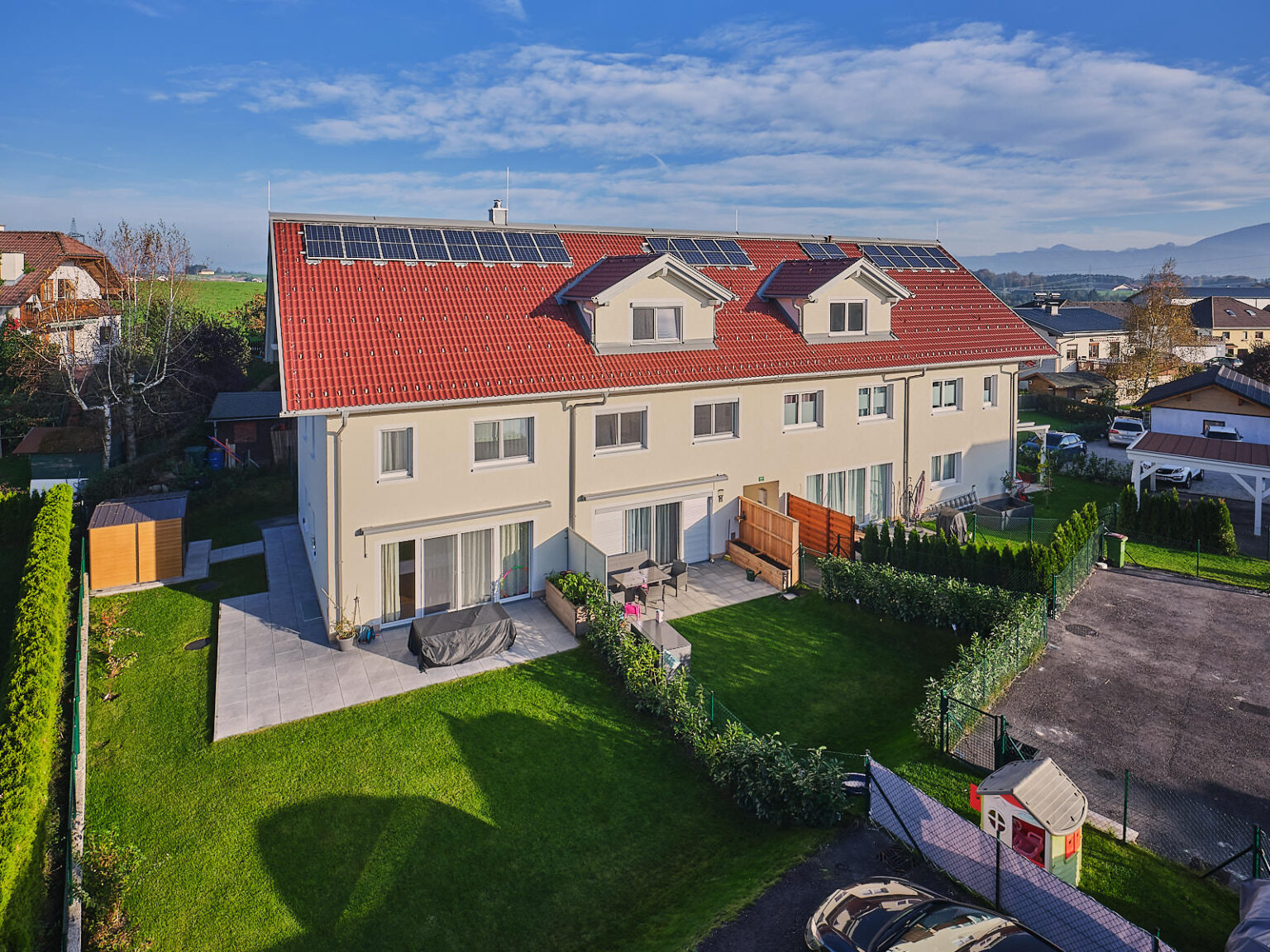 Im Seekirchner Stadtteil Mödlham wurden in absoluter Ruhelage vier Reihenhäuser mit bis zu 133 m² Wohnfläche errichtet. Im Erdgeschoß öffnet sich der extragroße Wohn- und Essbereich mit offener Küche zum sonnigen, großzügigen bis zu 438 m² Garten. Im Obergeschoß sorgen drei große Schlafzimmer für höchste Lebensqualität. Im Dachgeschoß befindet sich ein bis zu 33 m² großes Studio als Wohlfühl- und Relaxoase!